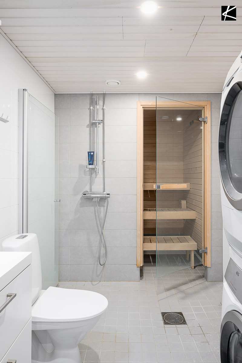 | Kylpyhuone | Varusteet: suihkuseinä, pesukone, kuivausrumpu, pesukoneliitäntä, lattialämmitys, wc-istuin, suihku, peilikaappi, kiinteät valaisimet Seinät: kaakeli Lattia: laatta |