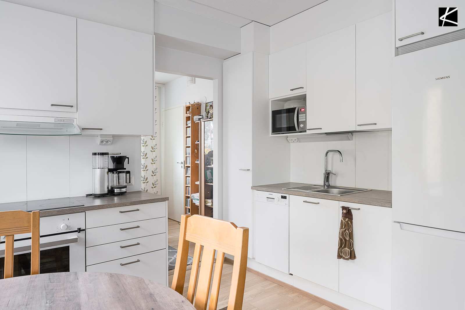 | Keittiön varustus | Jääkaappi ja pakastin: jääkaappi/pakastin Tasot: laminaatti Seinät: maalattu Lattia: parketti Muut varusteet: liesikupu, astianpesukone, varattu paikka astianpesukoneelle, kiinteät valaisimet Liesi/uuni: keraaminen, muu |