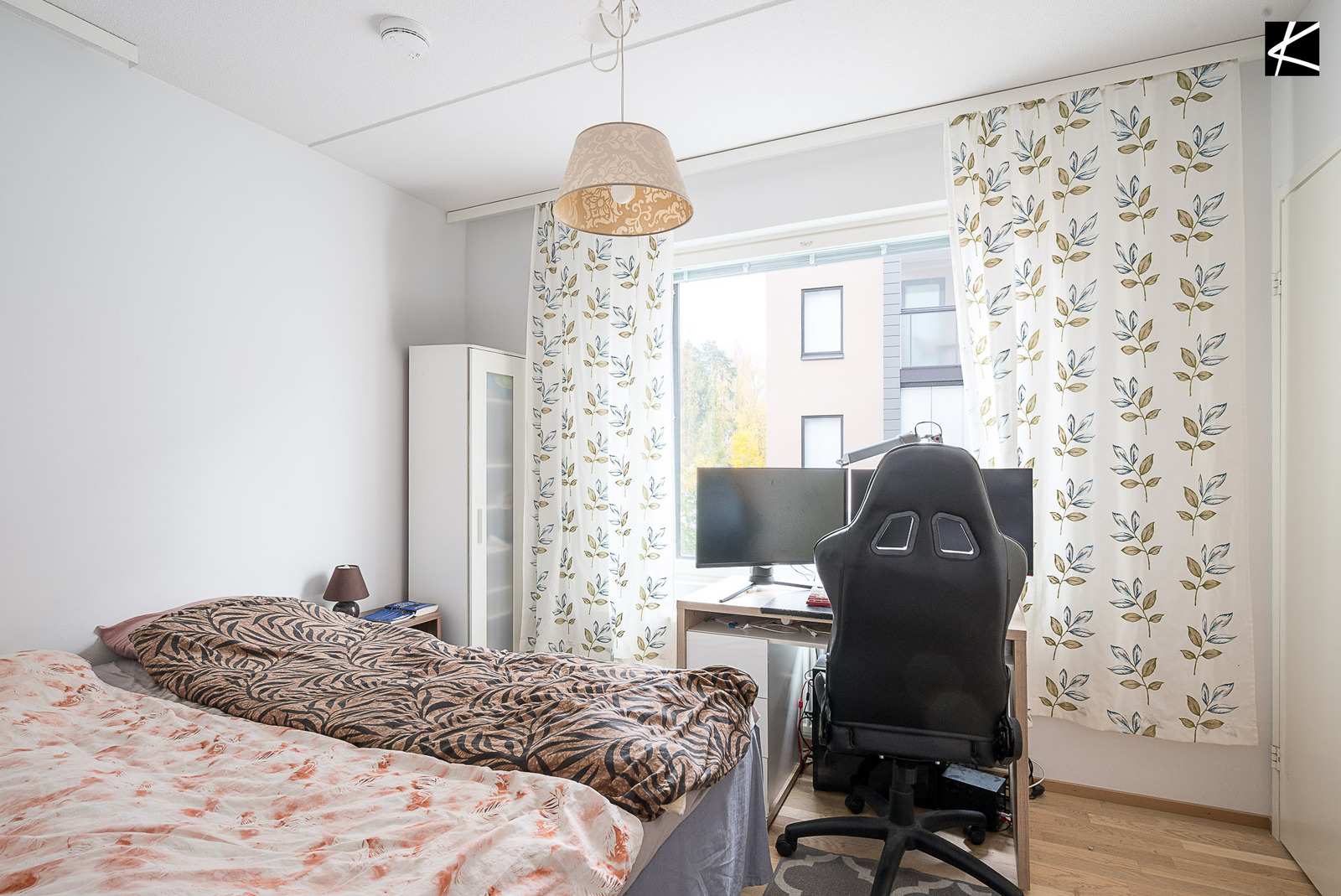 Tämä toisen kerroksen kulmakoti (ei kuitenkaan maantasolla). Kodissa on lisäsi mm. vaatehuone ja lasitettu parveke.