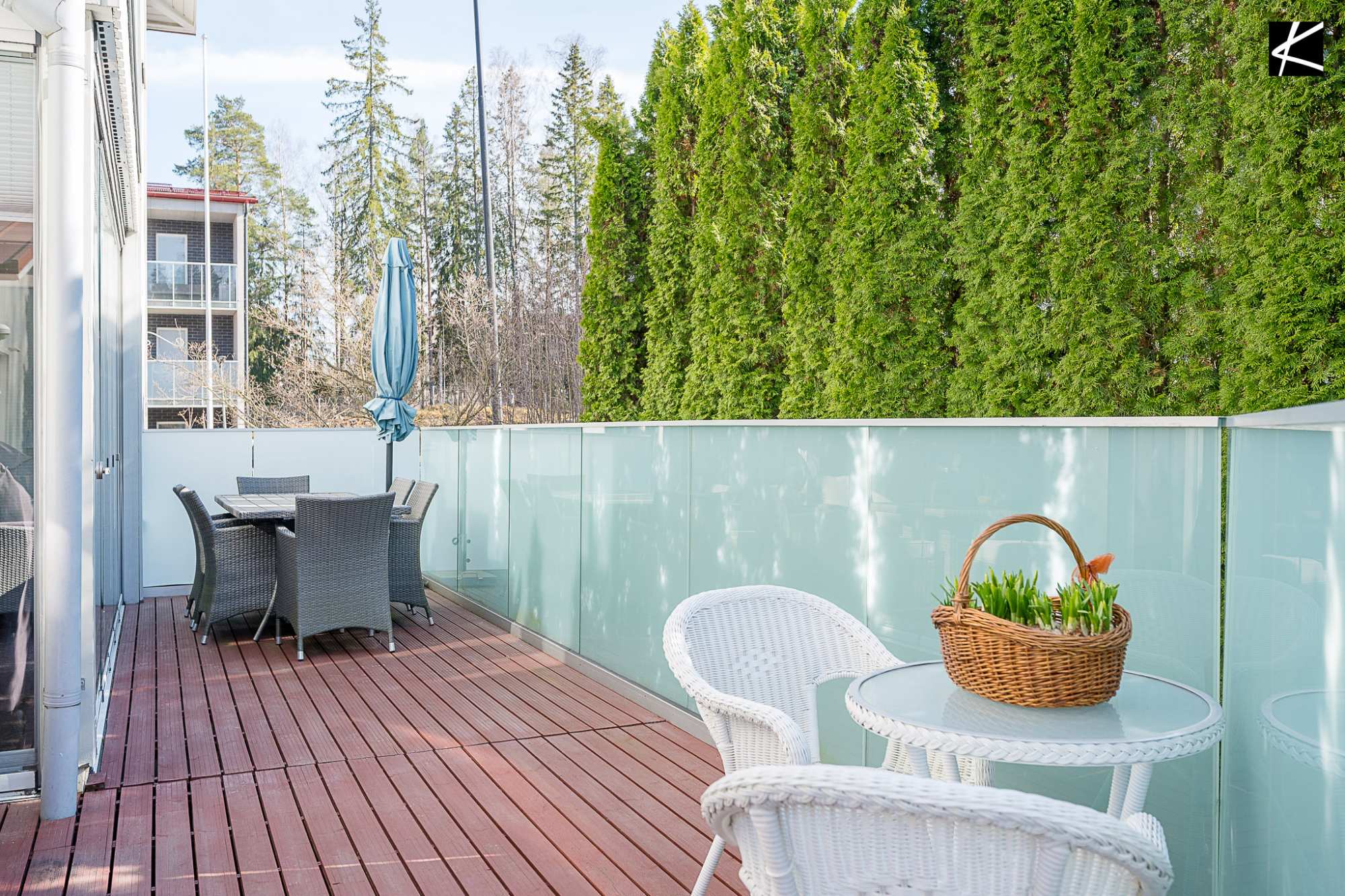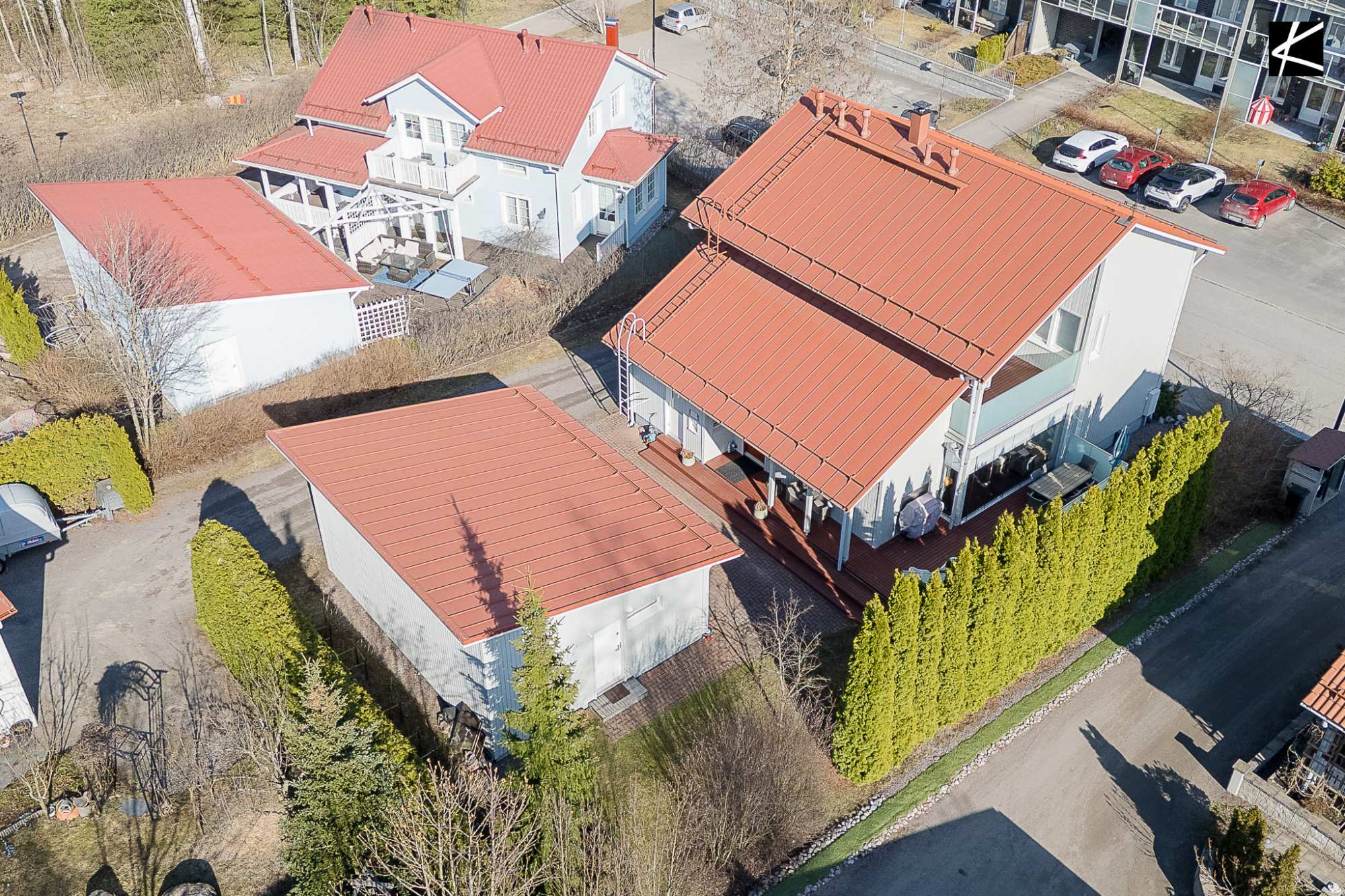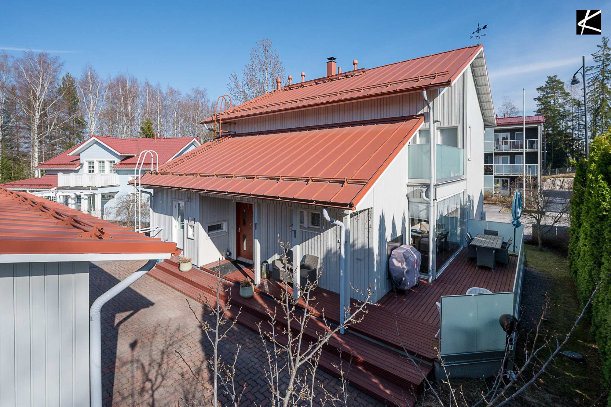 Kodin pintamateriaalit ovat huolella suunniteltuja ja muodostavat huolitellut piha-alueen kanssa yhtenäisen ja tyylikkään kokonaisuuden. Upea, osittain kahden kerroksen korkuinen olohuone isoine ikkunoineen luo avaran ja valoisan tunnelman. Olohuoneeseen sekä erilliselle, katetulle ja lasitetulle terassille avautuva kesäterassi huokuu laatua ja toimivuutta. Yläkerran yhteydesssä on katettu sisäänvedetty parveke. Alakerran tilan asumismukavuutta lisää erillinen ja olohuoneeseen avautuva TV/kirjastohuone.